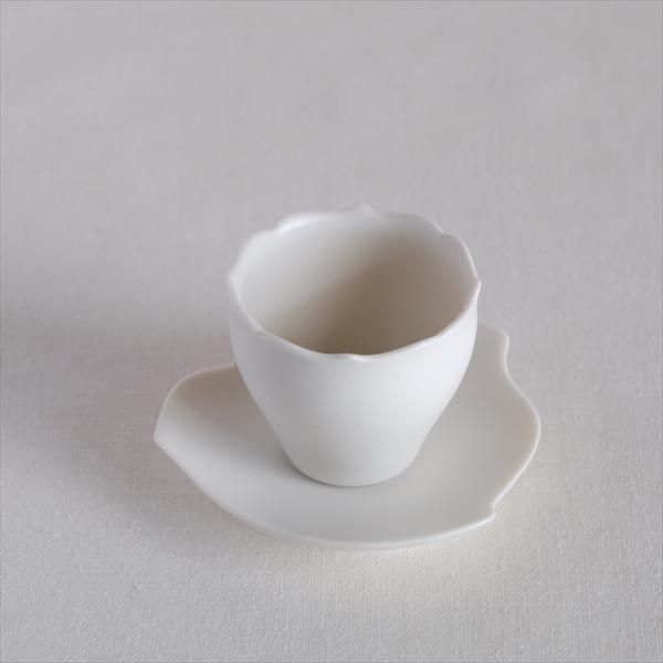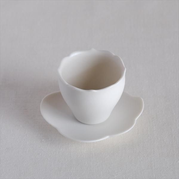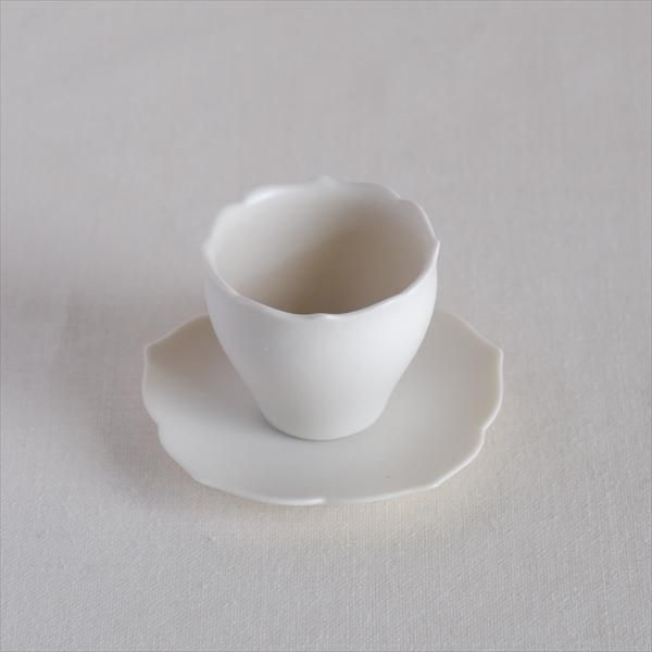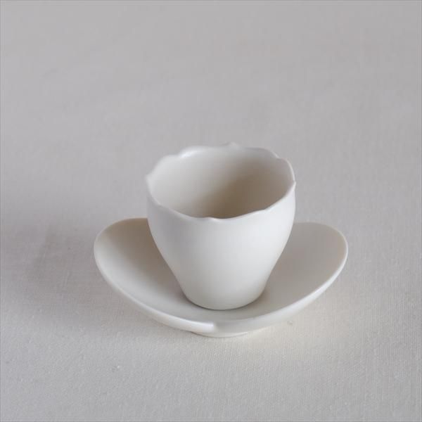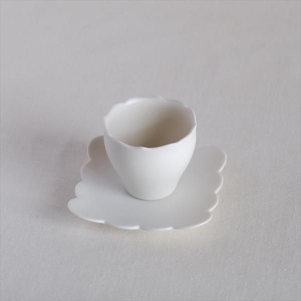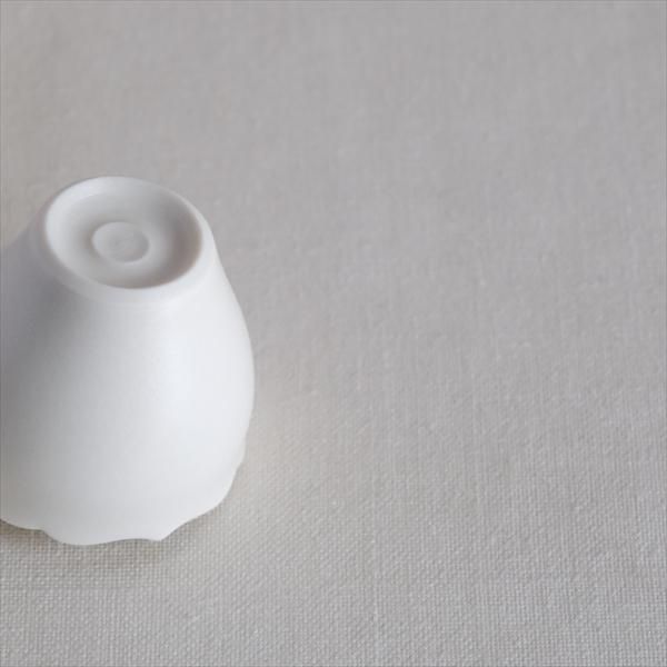 奥絢子 作 輪花杯 白 径約5.5cm 高さ約4.7cm 8分目で約40cc ¥4,950 どの角度から見ても美しい形です。 ロクロで磁土を丸くひき、乾燥させた後に、口縁をかりかりと丁寧に削って形づくりました。 割れやすい状態のところにそのような細かな作業をするなんて驚きです。 マットな白で、磁器ですがあたたかみのある雰囲気となっています。 中国茶や玉露にも、ぐいのみとしてもどうぞ。