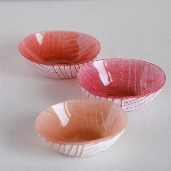 凹型に石膏型を作り、そこに白を塗り、粉状ガラスを貼り付けて窯で溶解して成形しました。
