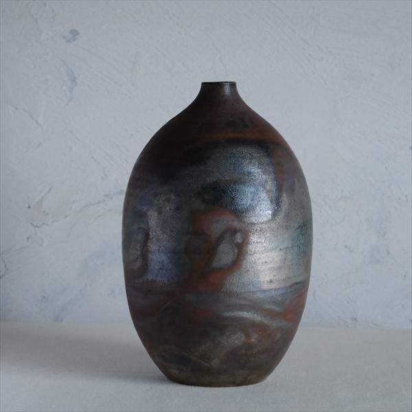 市野雅利 作 しずく型花入 径約14.6cm 高さ約23.2cm 口径内寸2.6cm ¥38,500 登り窯で、地元、丹波の土を焼成しました。 炎の当たりにより色が変化し、味わい深い面白い色合いになりました。 おおらかなロクロが素敵です。 緑の枝を一枝挿すだけでもとても素敵です。 1周、炎による美しい模様が刻まれています。 その日の気分で正面を決める楽しみがあります。