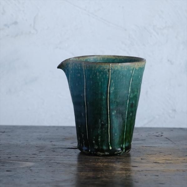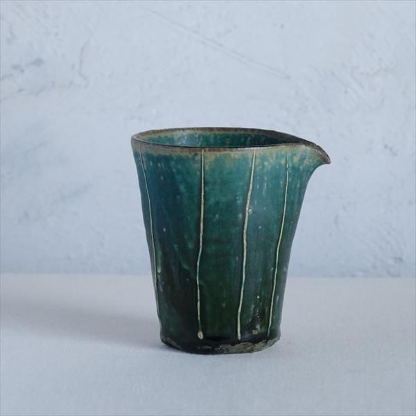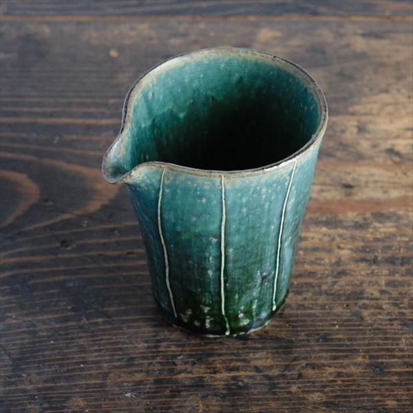 木曽志真雄 作 片口 オリベイッチン 横約9.8cm 幅約8cm 高さ約10.3cm 口縁1cm下で約260cc ¥7,700 木曽さん独特のマットな織部が素敵です。 その上にイッチンで縦線を施しました。 とても素敵ですね。 液だれしないので気持ちよくお使いいただけます。 お酒にも、茶海や湯冷ましにもどうぞ。