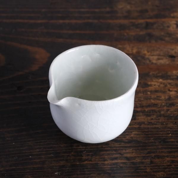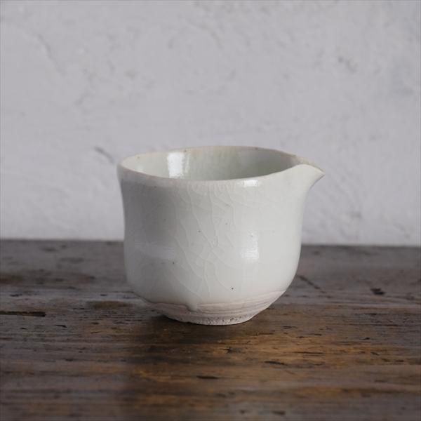 鶴野啓司 作 白瓷片口 a 径約6.5cm 高さ約5.5cm 口縁1cm下で約80cc ¥8,800 白瓷を薪窯で焼成しました。 薪窯ならではの表情が素敵です。 手びねりで成形したかのような、ふっくらとやわらかい丸みをおびた形も魅力的。 小さめの片口です。 ドレッシングやミルクなどなどにも。 液だれしませんので、気持ちよくお使いいただけます。