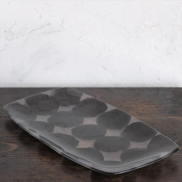 凹型に石膏型を作り、その型に黒で丸を描き、粉状ガラスを敷き詰めて窯で溶解して成形しました。