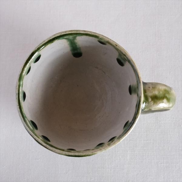 口縁と持ち手に施された織部釉の緑がアクセントに。